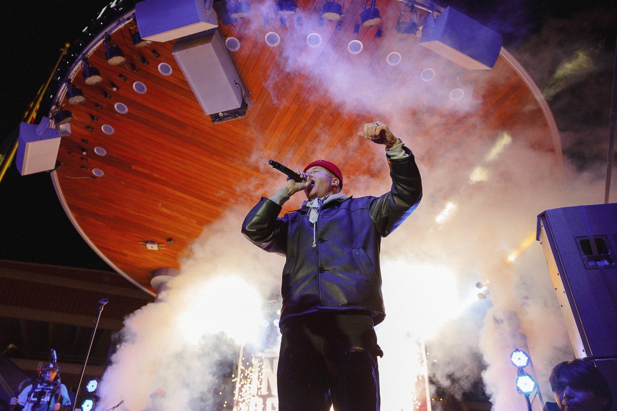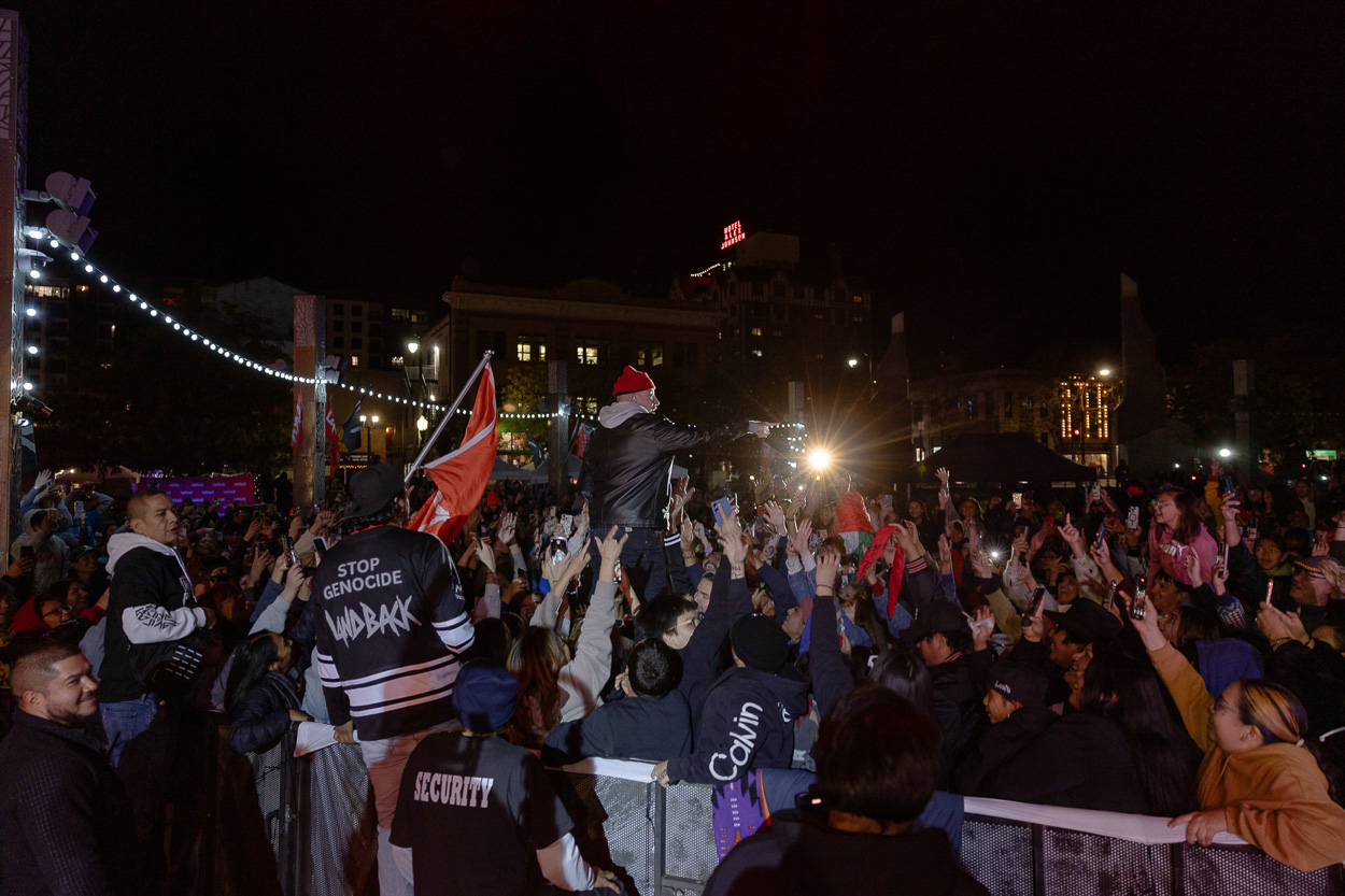 During his set, the crowd vigorously danced along to his hit songs, including ‘Glorious’ and ‘Can’t Hold Us,’ a fitting tribute to this day of celebration and resistance.