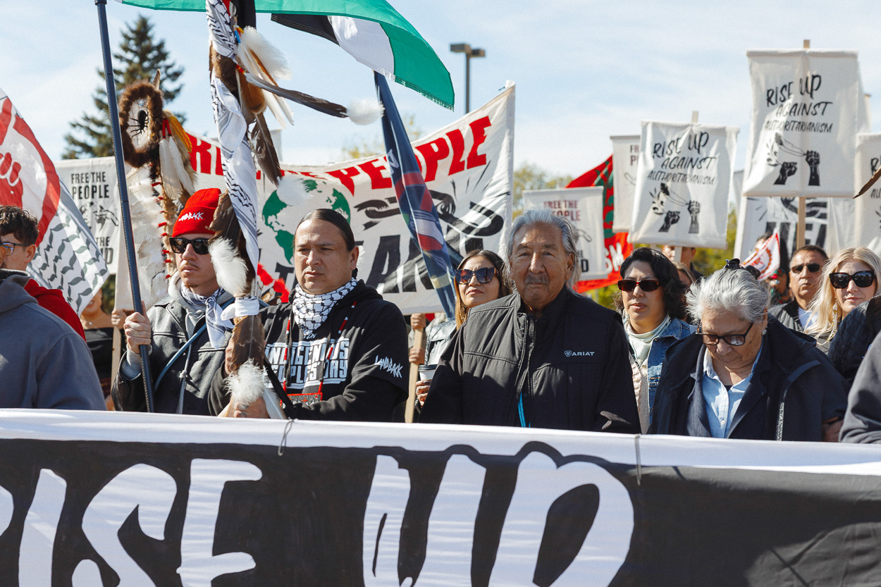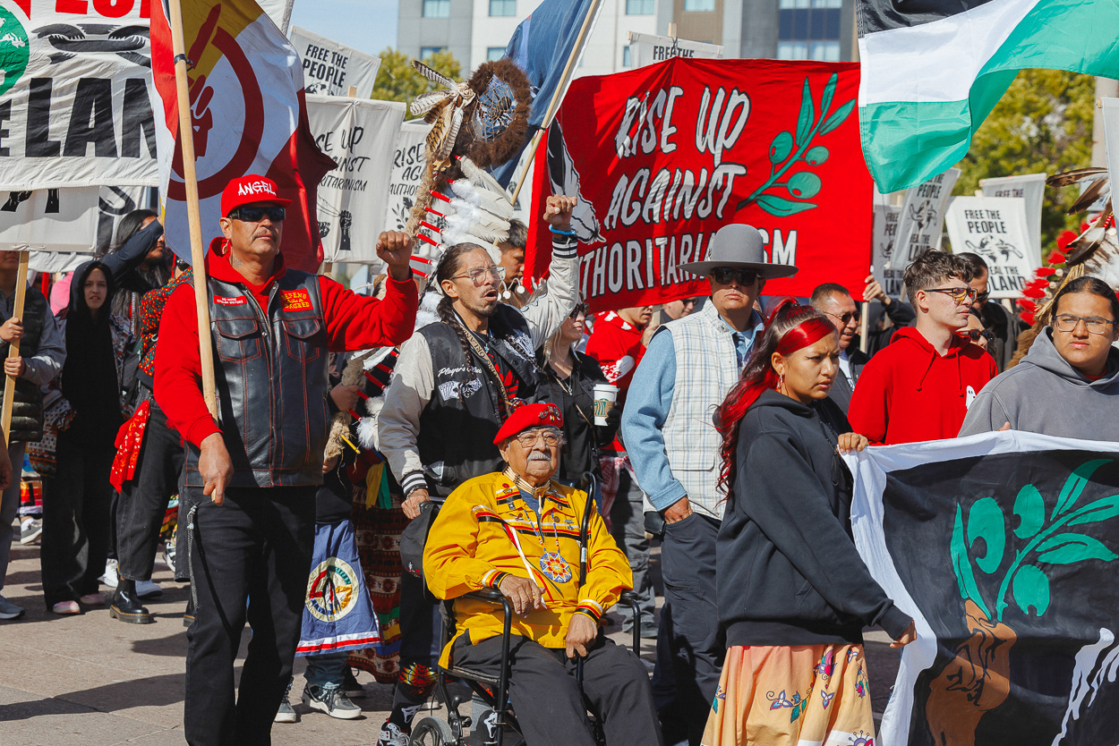 As the crowd lined up in preparation to march down 5th Street toward Main Street Square, an ATV pulled up to the front of the gathered people. From the vehicle emerged movement elder Leonard Peltier (Turtle Mountain Band of Chippewa), the recently freed American Indian Movement member who spent nearly 50 years behind bars for standing up against an unjust system. This was Leonard’s first-ever Indigenous Peoples’ Day celebration.