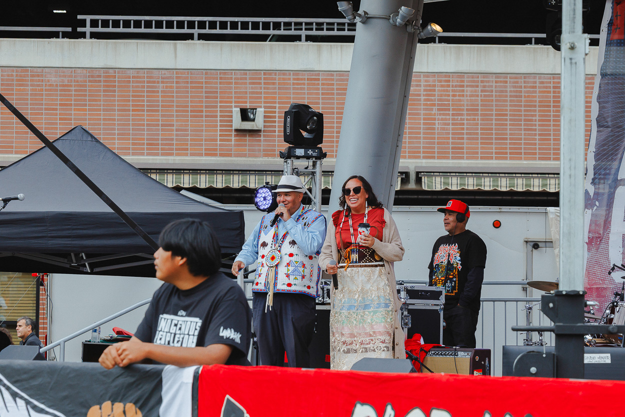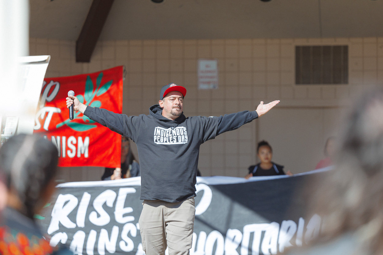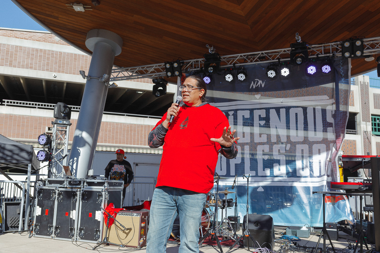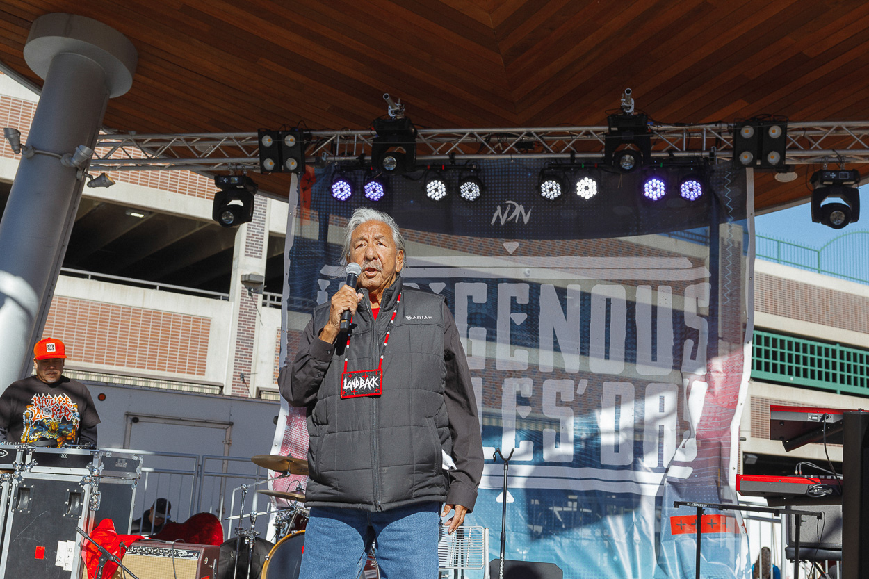 When Nick took the stage, he spoke of the warriors of the movement who came before and fought for the rights and lands of Indigenous People. He then welcomed Leonard Peltier to the stage to speak to the people on his first Indigenous Peoples’ Day as a free man.